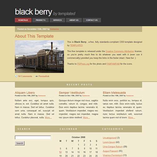 A nice general purpose design, with a large "featured post" area, three feature boxes, and room for various widgets. Gray, beige, brown color scheme with red accents.