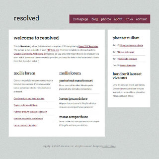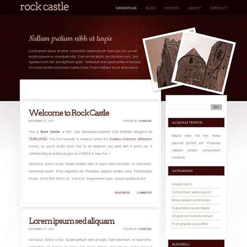 A portfolio/travel/something blog design. Two photos in the upper right, sidebar on the right, maroon/white color scheme.