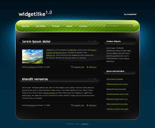 A dark, uber-glossy two column template designed to look like a gigantic desktop widget.