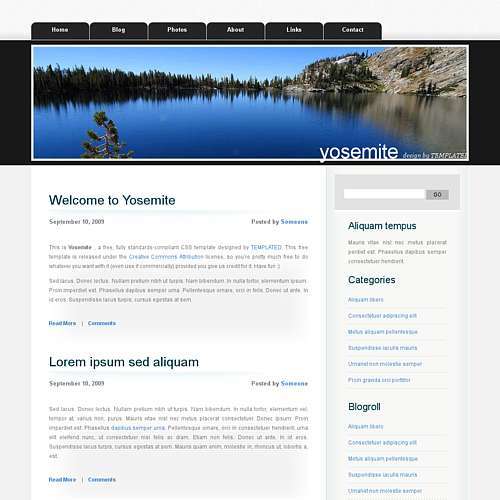 A simple outdoors-inspired two column blog design. Large banner. Tabbed navigation.