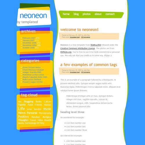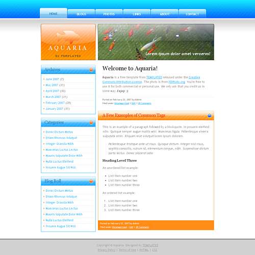 An uber-glassy two column design with a really bright color scheme (blue/orange/green/white), bubbly headings, and a tab-style nav.