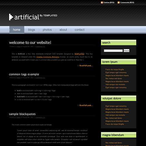 A two column lightweight design. Somewhat dark. Black/gray/green/blue color scheme with orange accents.