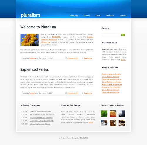 A compact two column design. Nice use of shadows and gradients to add depth, a very glossy blue header area, and a very functional footer.