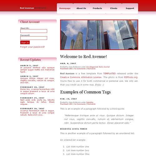A simple and straightforward general purpose design. Two columns. Red/white/dark gray color scheme. Star motif.