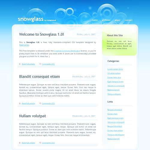 A unique enclosed two column design with an attractive "glassy circle" background and an assortment of other cool visuals. Blue/green/white color scheme.