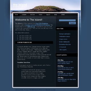 A dark, compact two column design built around an image of a solitary island. Dark gray/blue color scheme.